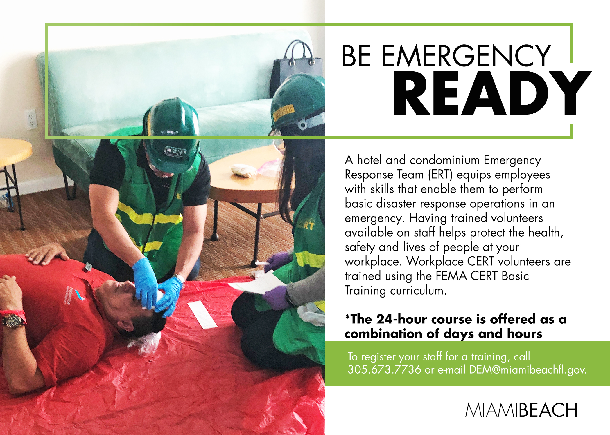 A hotel and condominium Emergency Response Team (ERT) equips employees with skills that enable them to perform basic disaster response operations in an emergency. Having trained volunteers available on staff helps protect the health, safety and lives of people at our workplace. Workplace CERT volunteers are trained using the FEMA CERT Basic Training Curriculum.