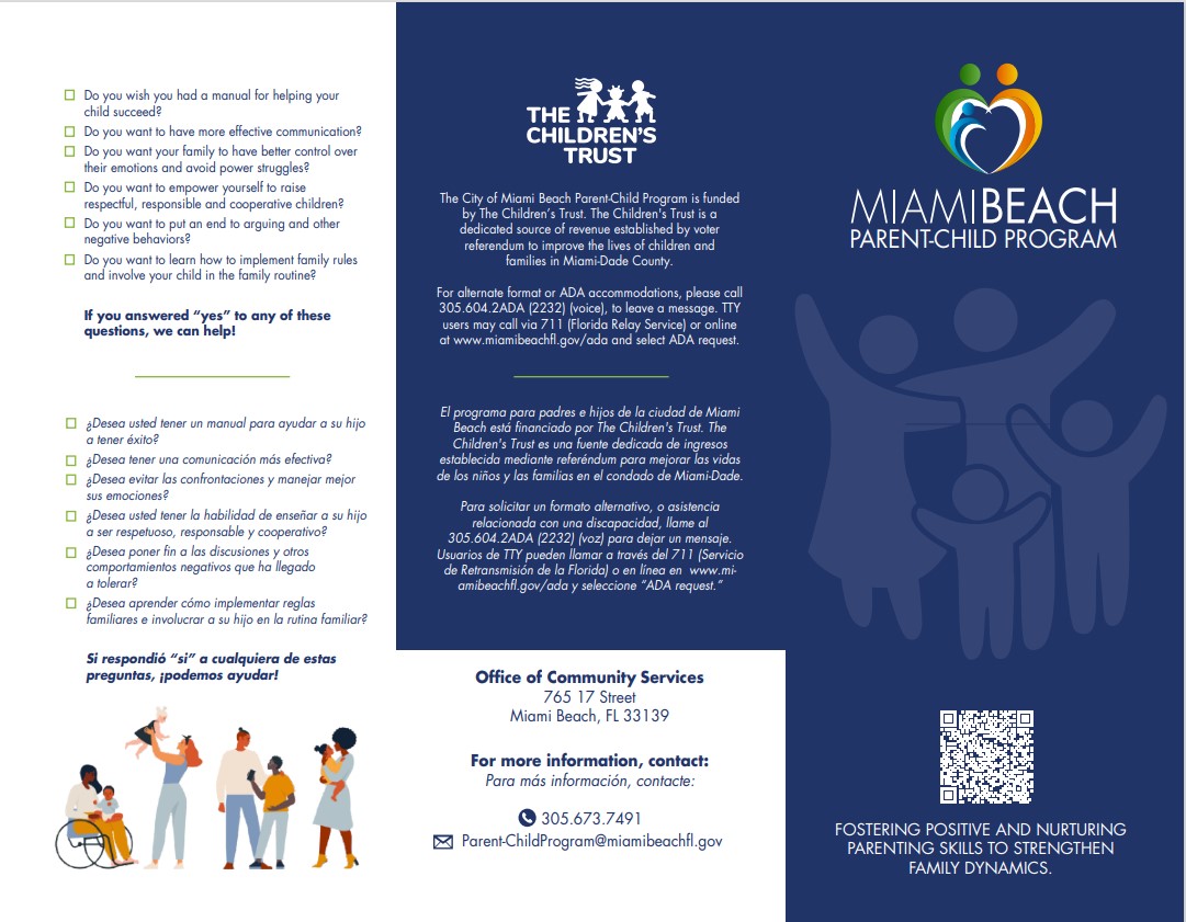 For more information about our Parent-Child Program, please contact the Office of Housing & Community Services at 305.673.7491 or e-mail us at  Parent-ChildProgram@miamibeachfl.gov