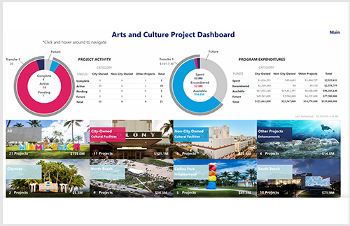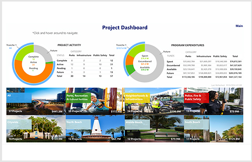 Our IT department has developed comprehensive dashboards that provide detailed reports on the city's various initiatives. Please click on the thumbnails below to view the dashboards.