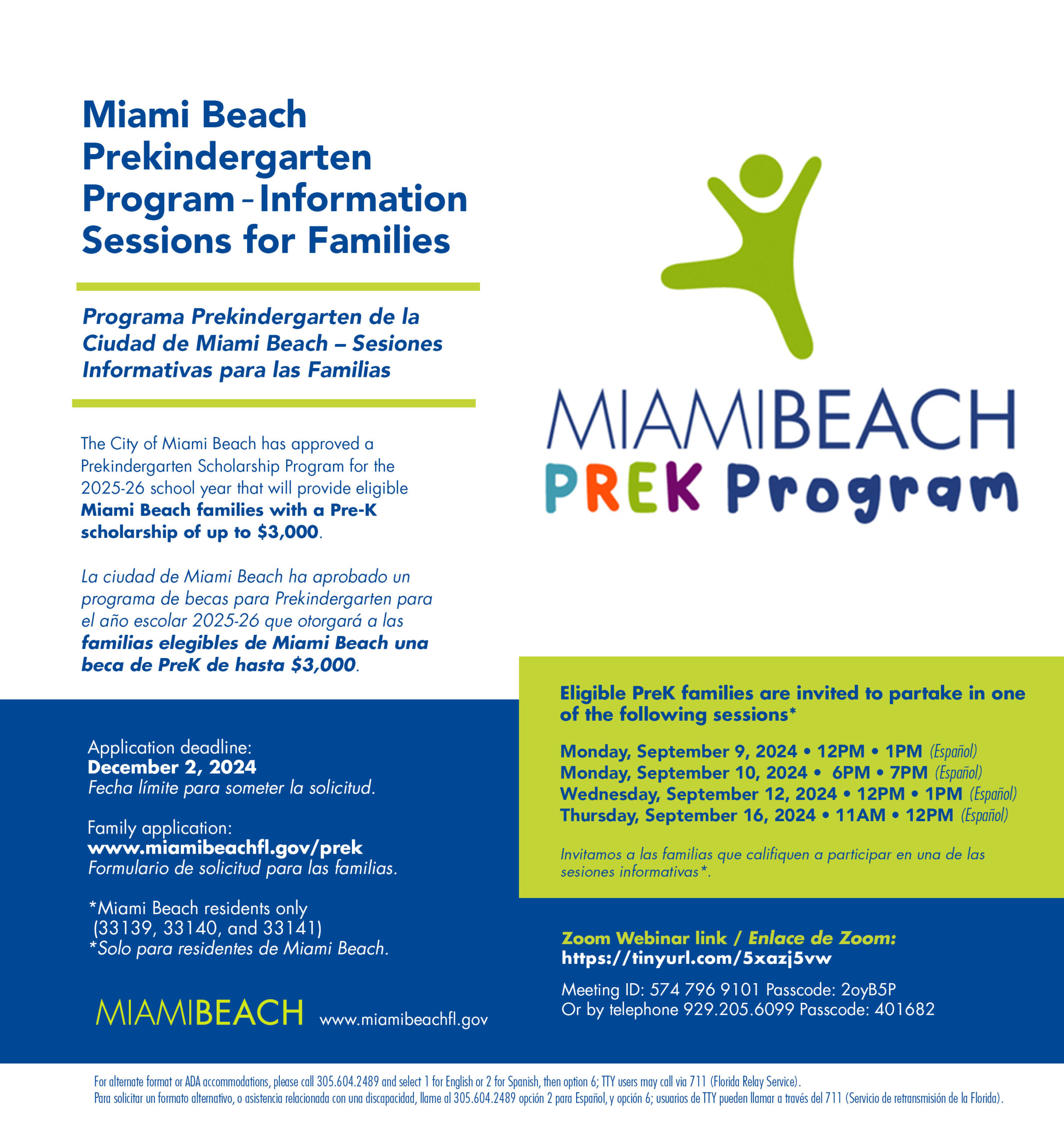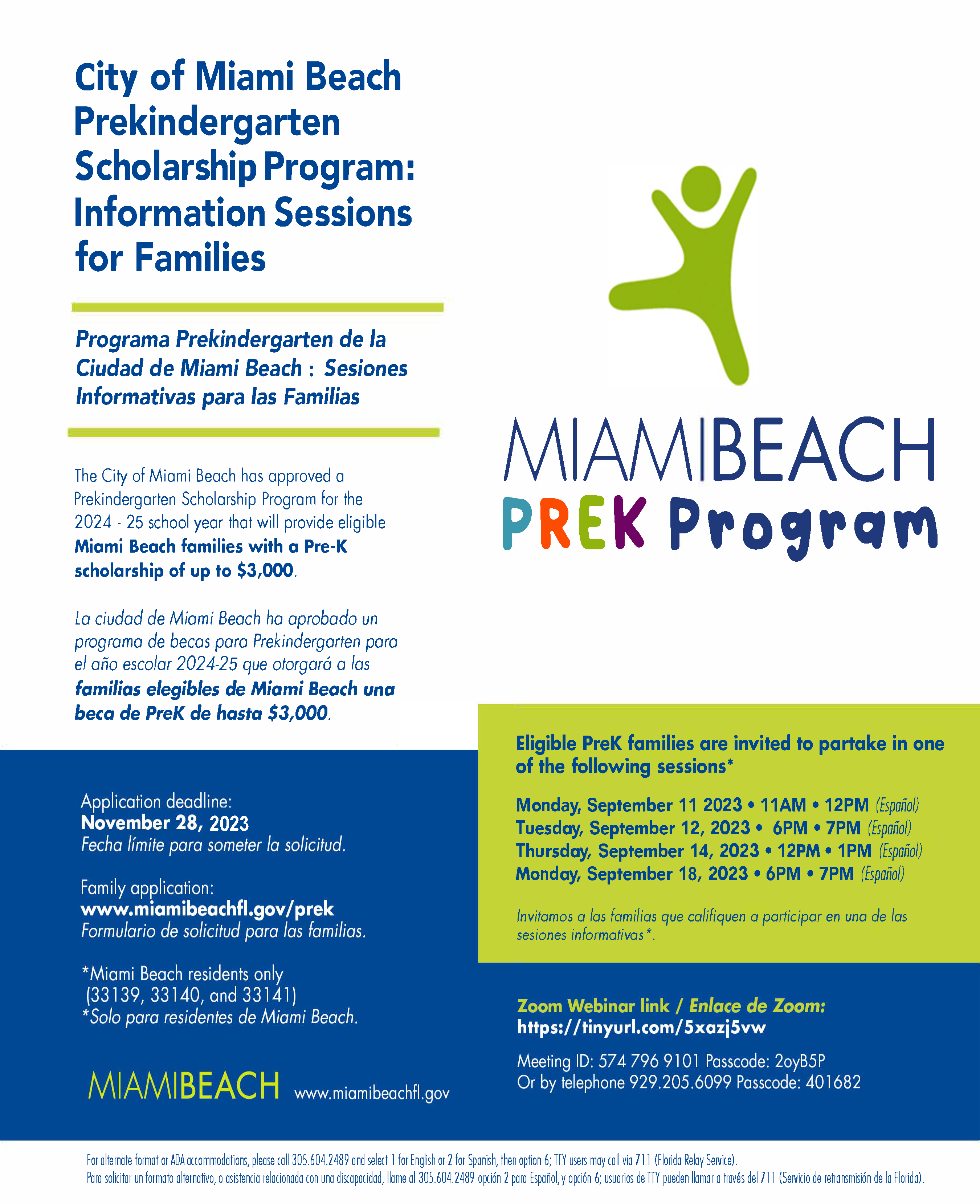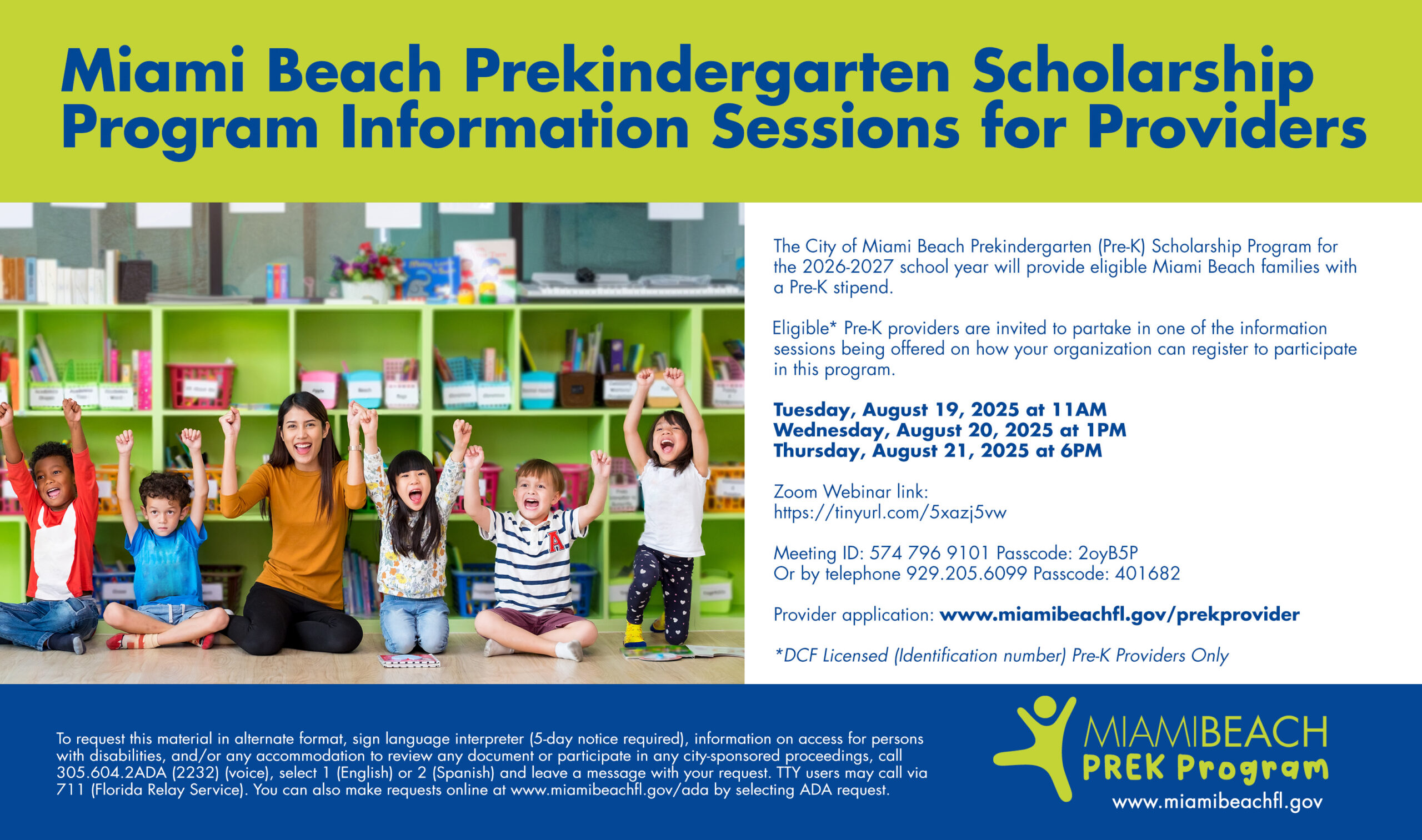 The City of Miami Beach has approved a Prekindergarten Scholarship Program for the 2026-2027 school year.  The CITY will provide a scholarship, in an amount of up to $TBD per school year, to cover up to an additional 450 instructional hours representing up to 2.5 hours per day for 180 days, payable, on a reimbursable basis.  Program instructional hours may only be applied toward programming occurring during the regular school hours for PreK Scholarship Program.