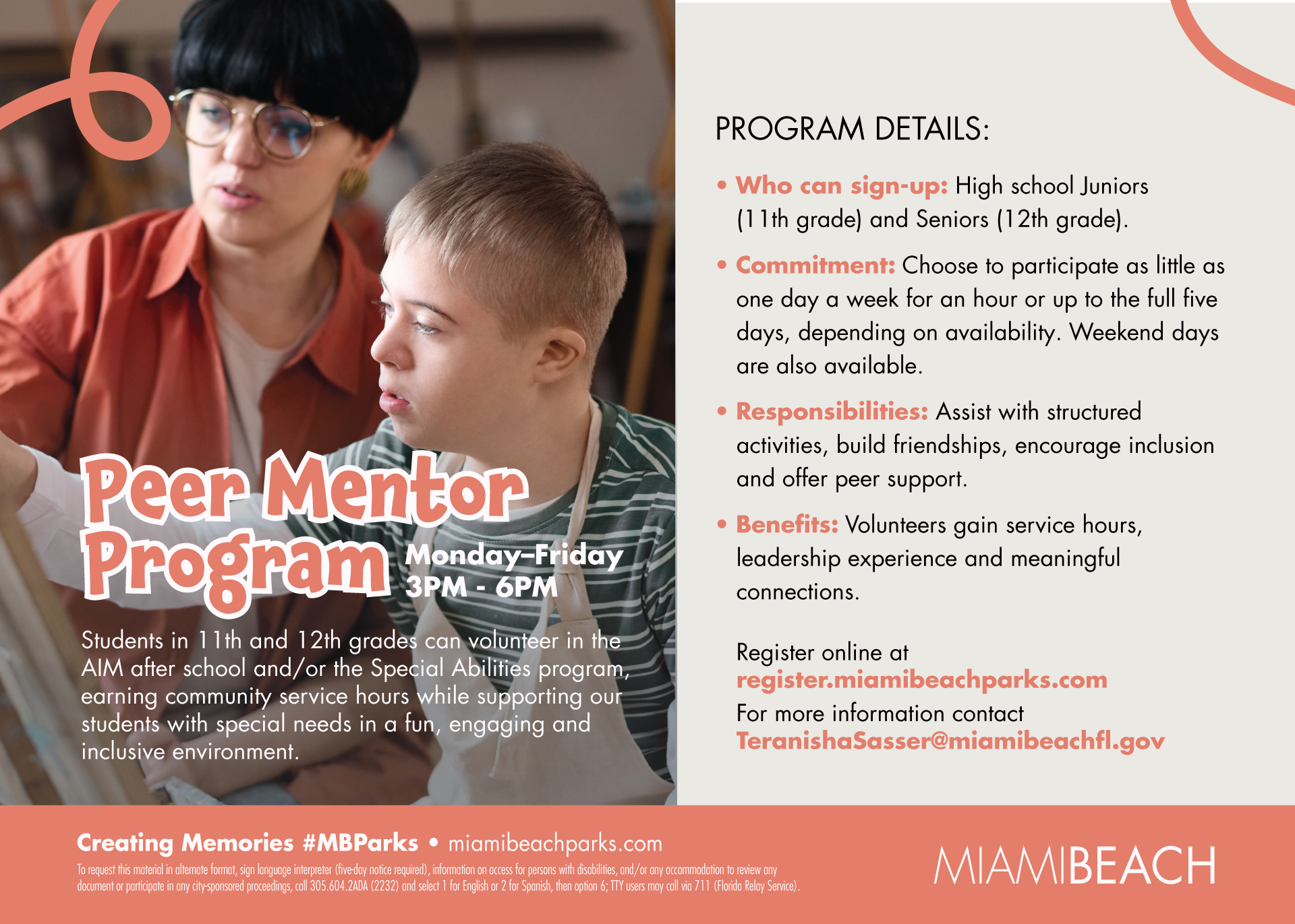 AIM is a free inclusionary program for children with special needs who are enrolled in the Teen Club Program at the Scott Rakow Youth Center. Special needs participants are partnered with teens their age and they participate tandemly in different activities and events. Activities include athletics, social skills classes, and recreational outings. Space is limited. Contact teranishasasser@miamibeachfl.gov for more information.