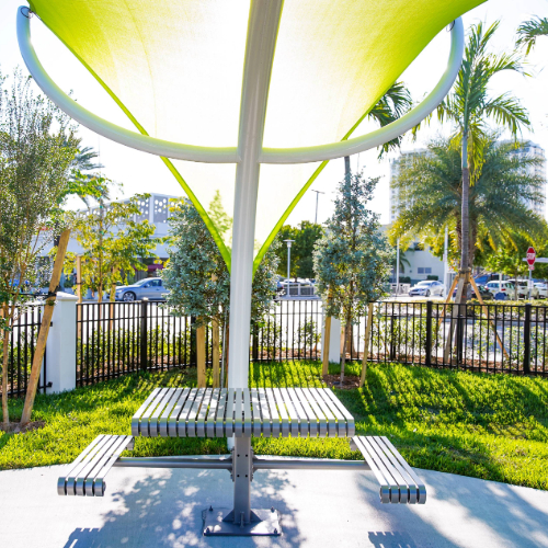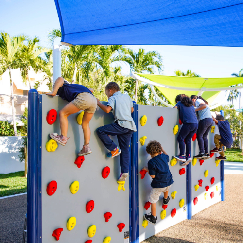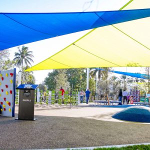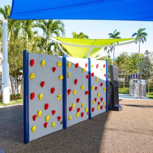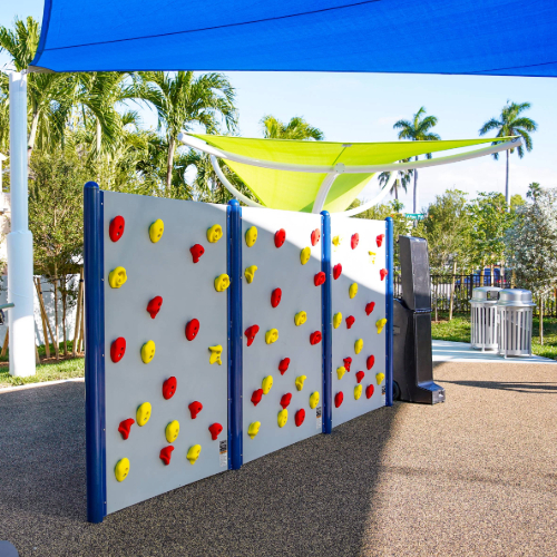 Three shade sails, two smaller canopies over picnic tables, benches, colorful play surfaces, play mounds, corn stalks and two climbing walls. This park also features a library box for the community to share books.