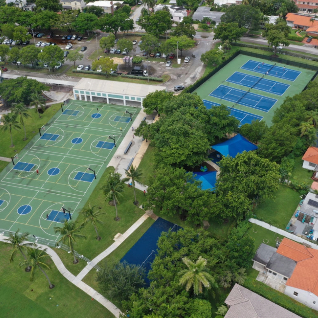 Outdoor public tennis and pickleball courts, USE fitness station, basketball courts, a softball field, open field area and walking path. By permit usage in season.