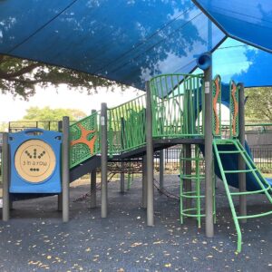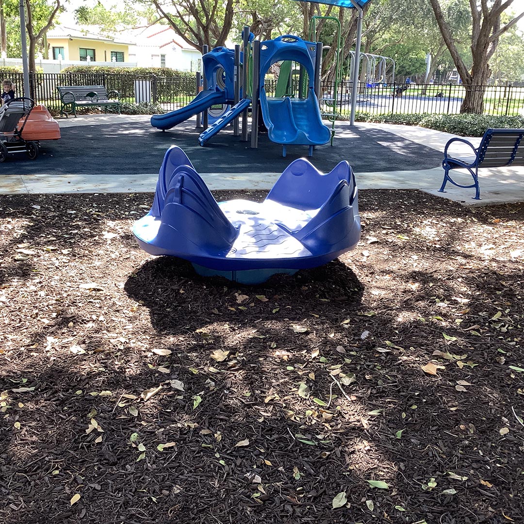 Shaded play component with mulch and poured-in-place rubber surfacing, spring rider and twirl around.