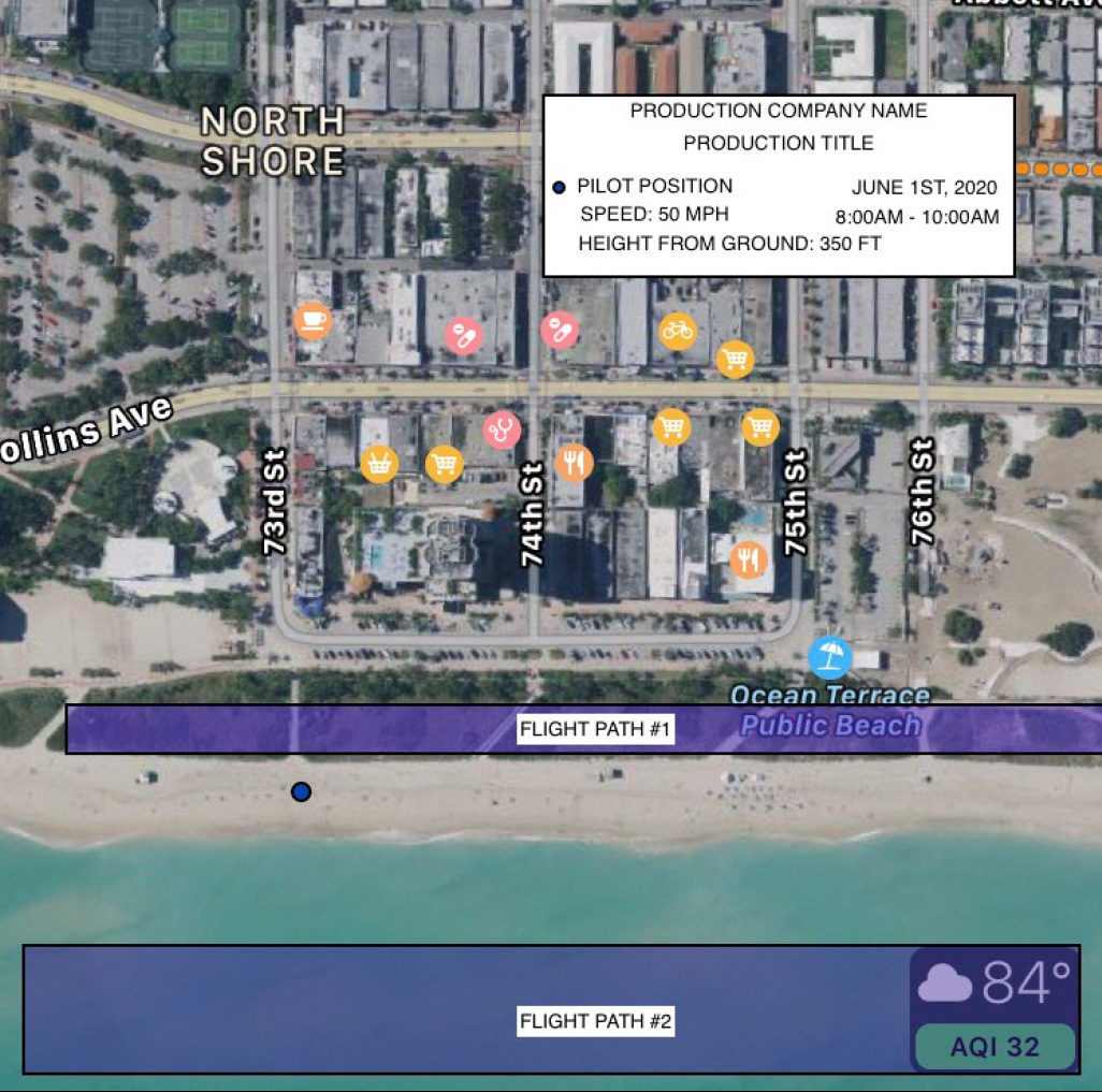 *When mapping the area, please keep in mind that the area of use must be free and clear to all general public during the use of a UAS for filming. Only the cast and crew hired by the production (and named under the worker’s compensation policy of the production) are allowed within the designated area as per FAA regulations, this includes the use of streets, beaches, sidewalks, and parks.