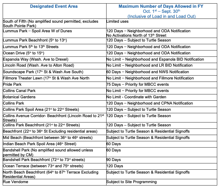 Except for grandfathered events, Special Event Permits cannot be issued for Lummus Park and Lummus Park Spoil areas north of 13th Street, or Beachfront between 13th to 16th Street, unless approved by the Mayor and City Commission.