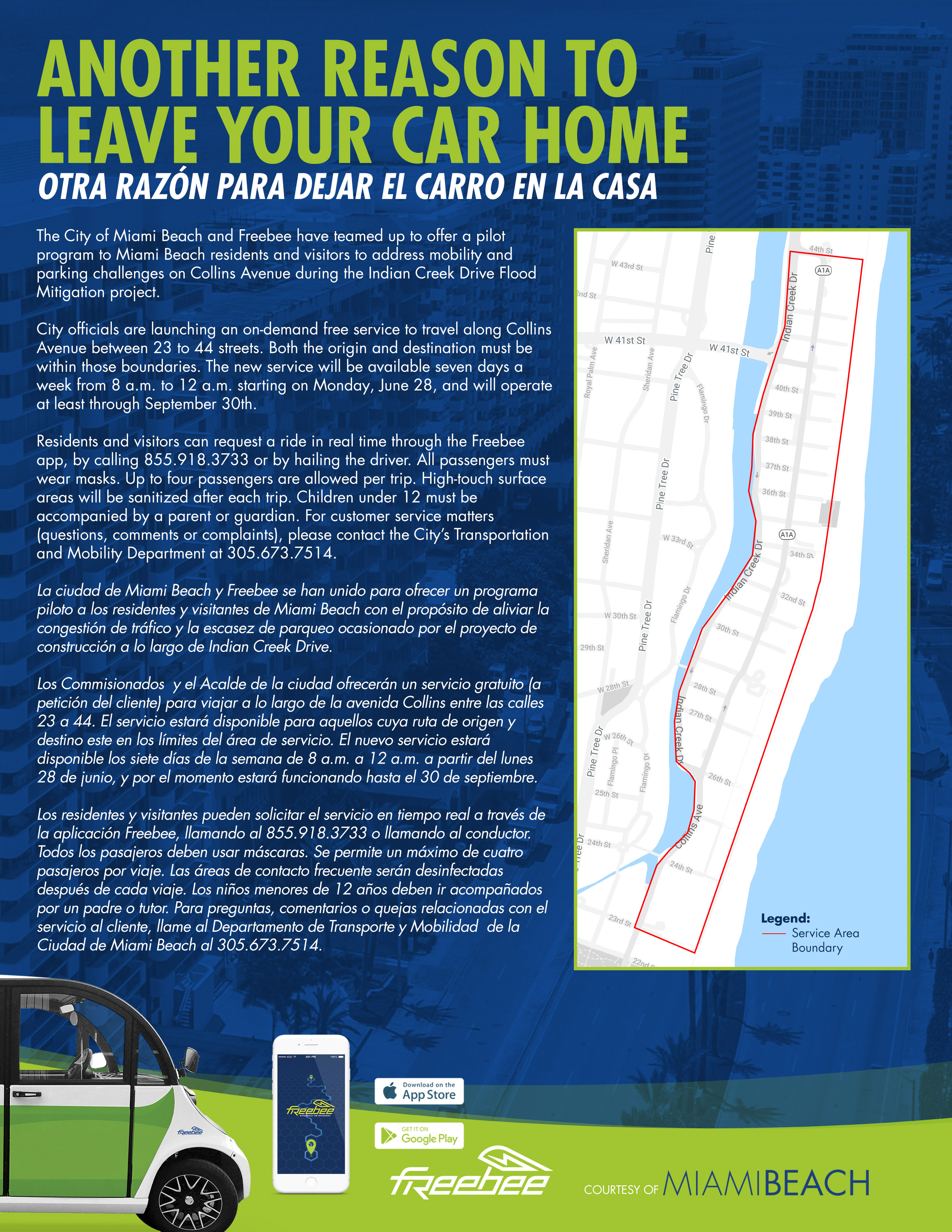 The City of Miami Beach and Freebee have teamed up to offer a pilot program to Miami Beach residents and visitors to address mobility and parking challenges on Collins Avenue during the Indian Creek Drive Flood Mitigation project.