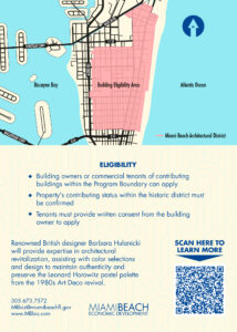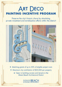 The Program will provide matching grants, covering up to 50% of eligible painting costs, with a maximum city contribution of $20,000 per property. The Program invites property owners and tenants, of contributing historic buildings, within the Miami Beach Architectural District, generally located between 5" Street and 23° Street, along Ocean Drive, Collins Avenue, and Washington Avenue, to participate in this collaborative effort to preserve and revive the city's historic landscape. The City is partnering with renowned British designer Barbara Hulanicki, a pivotal figure in architectural revitalization, to revitalize Miami Beach’s iconic Art Deco architecture. For additional information, please view the Art Deco Painting Incentive Program.