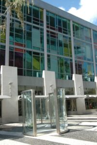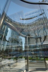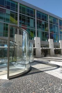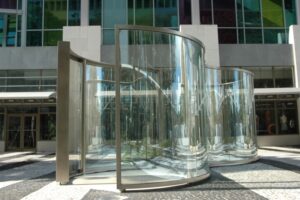 Dan Graham’s project for the new pedestrian part of Lincoln Road recalls the ‘kidney’ shape of the 1950’s Miami Beach hotel swimming pools. Both concave and convex lenses, the pavilion’s surfaces create mirroring an anamorphic ‘fun-house’ reflection of people inside perceiving themselves and other superimposed of people outside. The surfaces are simultaneously reflective and transparent.