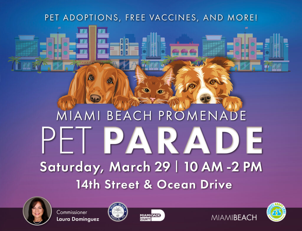 Miami Beach, FL – Pet owners and animal lovers alike are invited to join the first annual Miami Beach Promenade Pet Parade on Saturday, March 29 as they celebrate their four-legged companions in a whimsical event filled with creativity, community spirit and a whole lot of tail-wagging excitement. The event will take place in Lummus Park on Ocean Drive at 14 Place from 10 a.m. to 2 p.m. and is presented by Miami Beach residents in partnership with the Ocean Drive Association, Miami-Dade County Animal Services and the Miami Beach Mayor and City Commission.