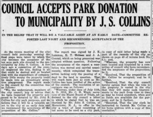 Nan dat 21 oktòb 1912, Konsèy Minisipal Miami Beach la te aksepte yon don dis kawo tè ekselan nan men John Stiles Collins. Tè sa a, ke yo rele kounye a Collins Park, sitiye nan 2100 Collins Avenue epi li te enstrimantal nan bay Miami Beach fòm.