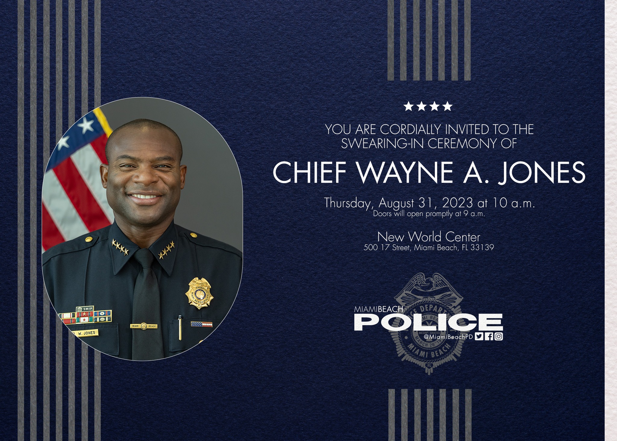 Join the City of Miami Beach on Thursday, Aug. 31 at 10 a.m. in the New World Center for the swearing-in ceremony of Chief Wayne A. Jones, who will become the city’s 21st Miami Beach Police Chief.