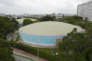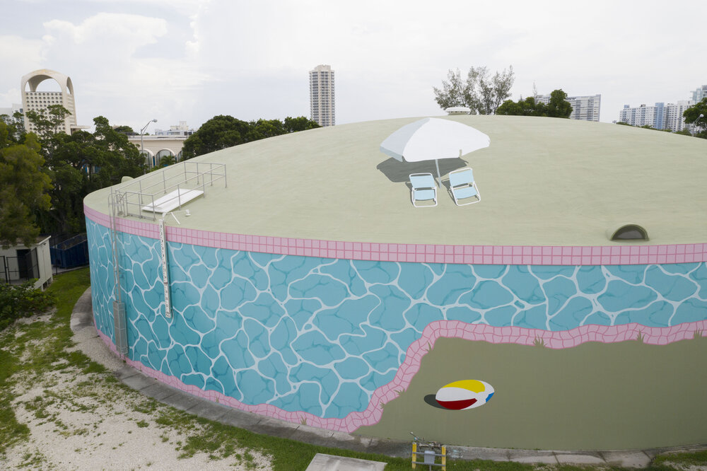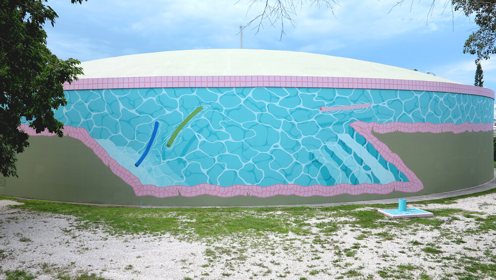 Formed by artists Allison Matherly and Jeffrey Noble, Nice’n Easy is recognized throughout South Florida for their visually cohesive subtropical vernacular – referencing beach scenes, palm trees, tropical foliage and lounge chairs often rendered in soft neon hues. For the North Beach Water Tanks, Nice’n Easy was inspired by the pool culture of Miami Beach and created a larger- than-life swimming pool that wraps the entire circumference of the water tanks. The artists accented the top of the water tank with lounge chairs and pool furniture, creating a unique view of the artwork for surrounding residential apartment buildings and airline passengers.