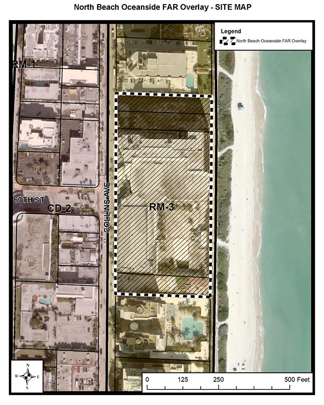 O Distrito de Sobreposição do North Beach Oceanside Resort ("Sobreposição") foi proposto para propriedades à beira-mar entre 6605 e 6757 Collins Avenue. A Sobreposição incluiria o imóvel do Hotel Deauville, localizado na Collins Avenue, 6701, e imóveis vagos ao norte e ao sul do Hotel Deauville. Esses imóveis estão no distrito residencial multifamiliar RM-3, com zoneamento de alta intensidade.