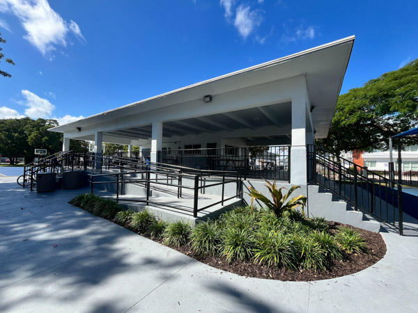 Características especiais: Componente de jogo sombreado com superfície de borracha moldada no local, adjacente a uma quadra de basquete, estação de condicionamento físico USE, campo aberto e duas quadras de vôlei de areia.