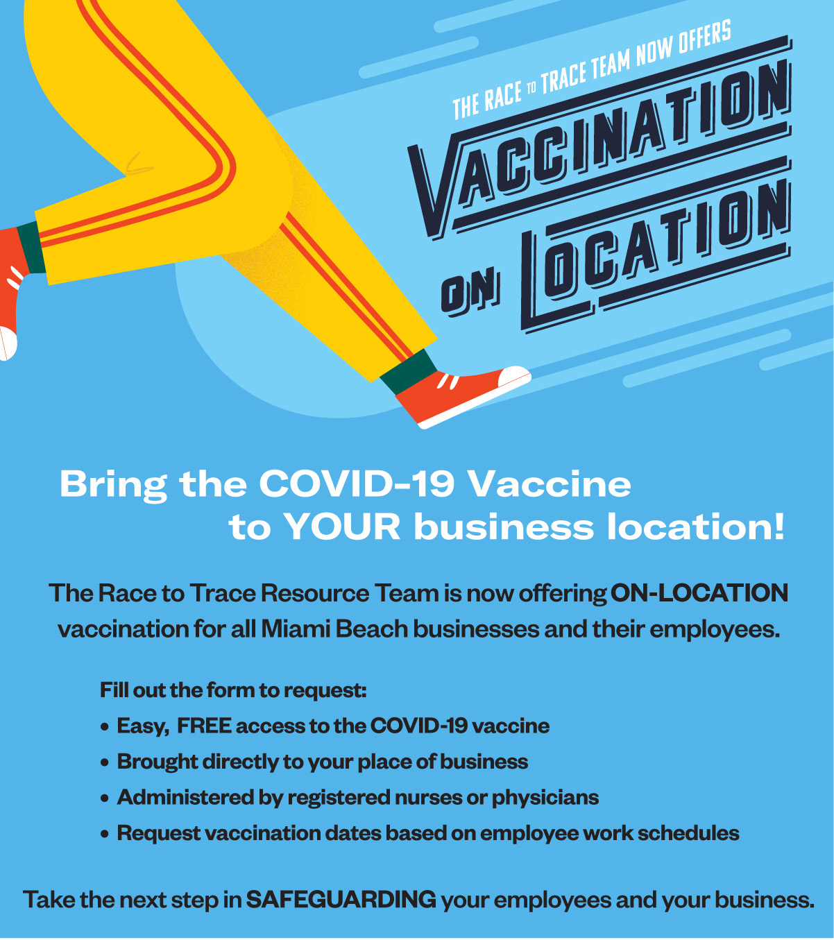 - NEW! Vaccinations on Location - The Race to Trace Team will come directly to Miami Beach businesses by appointment to administer the COVID-19 vaccine to employees.
