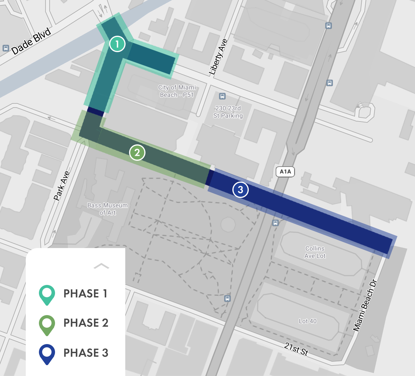 This project includes the installation of two-way buffered bicycle lanes along 23 Street between Dade Boulevard and Park Avenue, on Park Avenue between 23 and 22 Streets, and on 22 Street from Park Avenue to the Beachwalk. Additional improvements include parking modifications, new traffic signal mast arms, pedestrian signals, sidewalk, curb, and gutter replacement, as well as driveway adjustments.