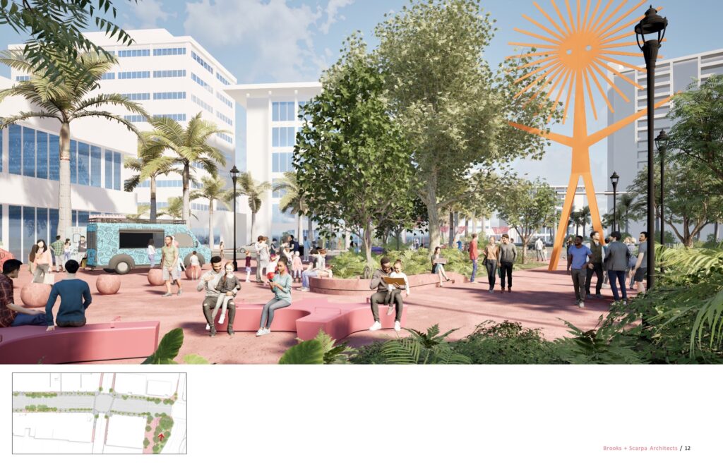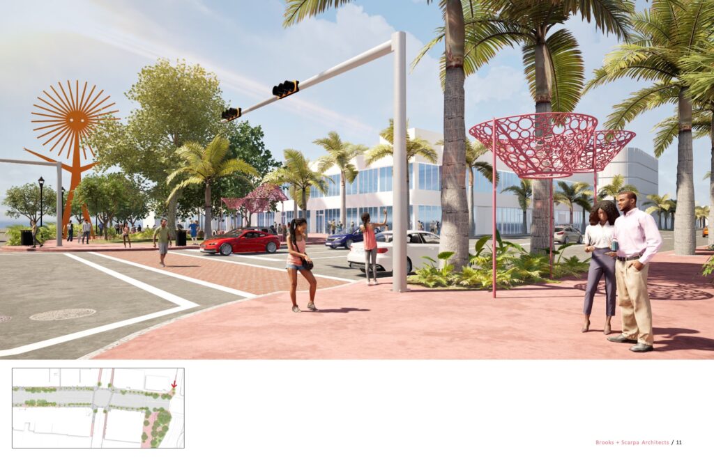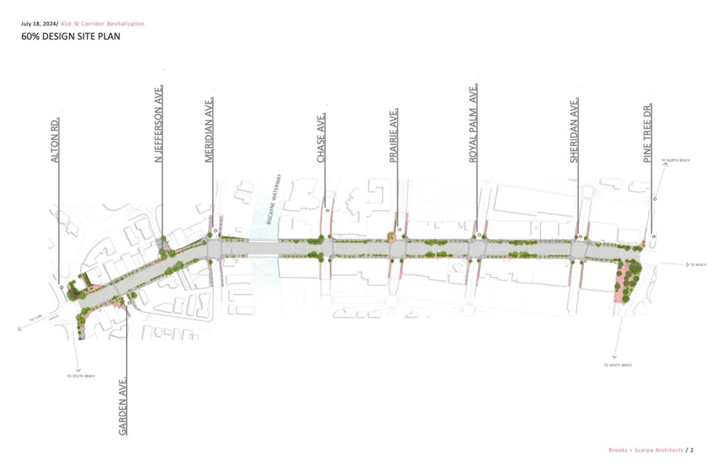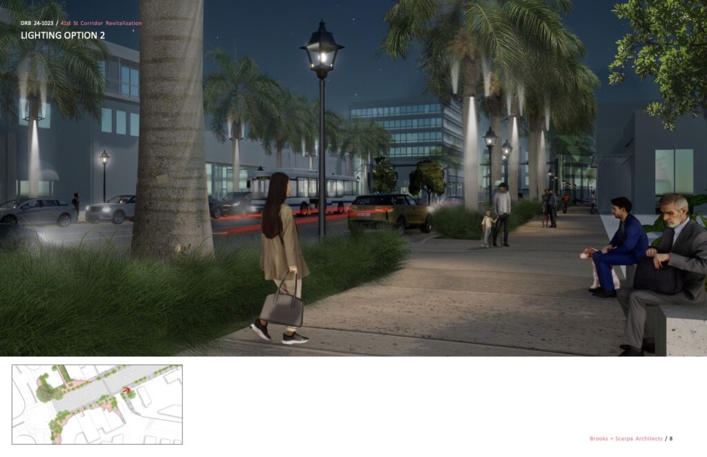 The 41 Street Corridor Revitalization Project includes a new streetscape design aimed at improving pedestrian walkability through new branded pavement, expanding shade tree canopy, and other landscaping. The project further aims to increase a sense of place with the creation of spaces with appropriate street furnishing, entrance features and artwork along the corridor.