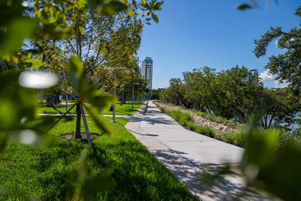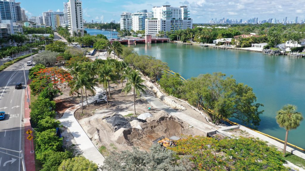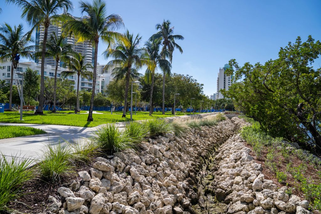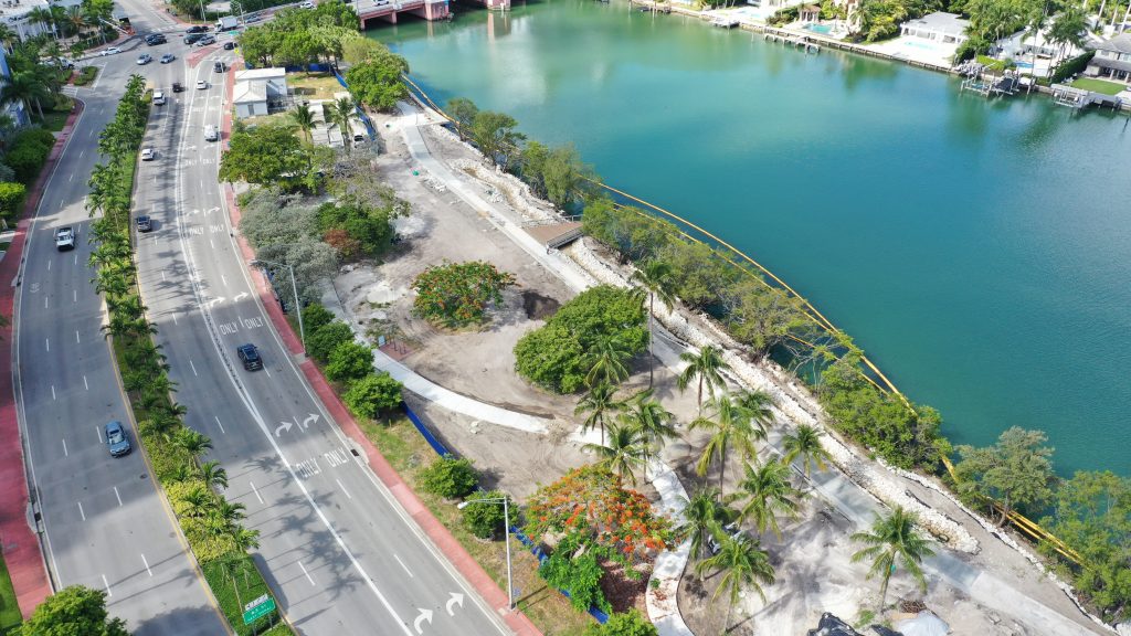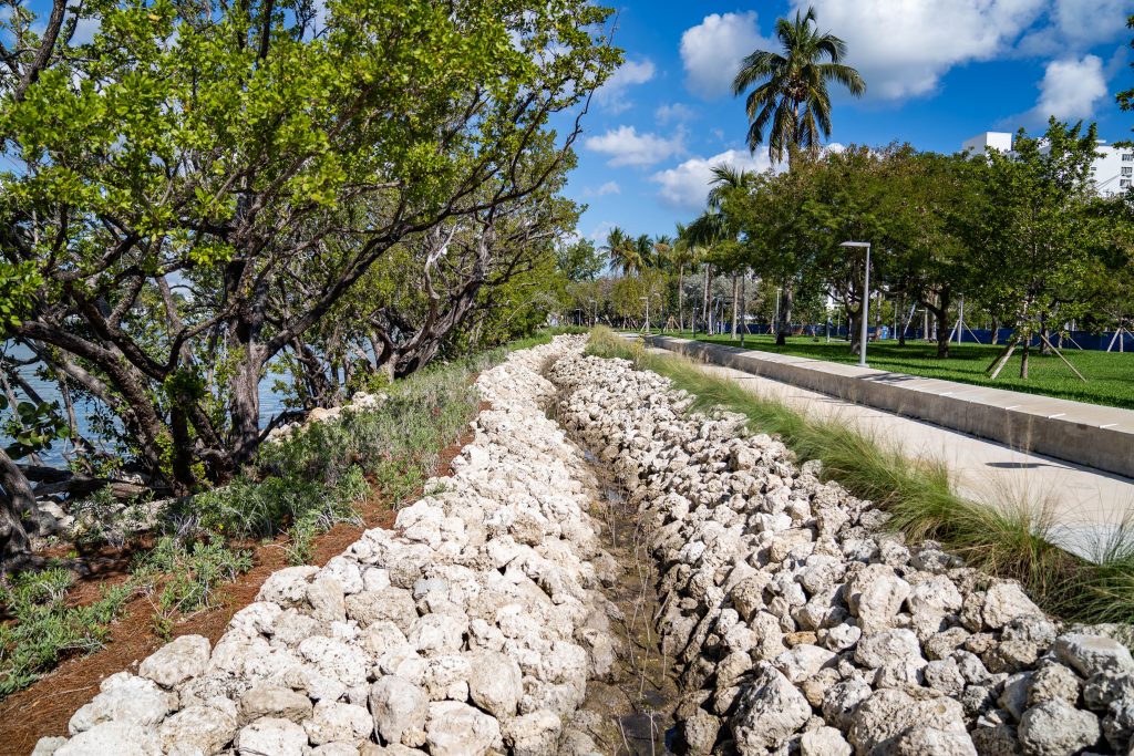 With cooperation from The Nature Conservancy and with support from Florida Power & Light Company through its charitable arm the NextERA Energy Foundation, the project will be the City’s second hybrid design that incorporates a living shoreline into a structural seawall. The structural seawall rehabilitated as a part of an earlier construction phase of the project was designed to protect several existing mangroves and create new coastal habitat. The current construction phase of the project includes the planting of more mangroves and other native wetland vegetation while removing invasive or exotic vegetation along the waterfront, and planting additional native shade trees including green buttonwood, gumbo limbo, and pitch apple in upland areas of the park.