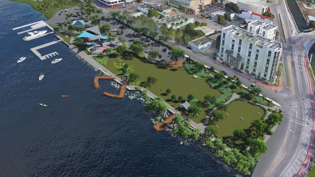 - Increasing the park’s resiliency by raising the seawall elevation, remediation of contaminated soil from a previous gas station use, increasing drainage capacity and providing native trees and shrubs.