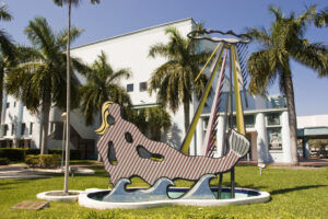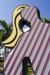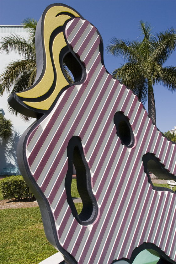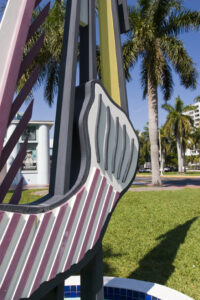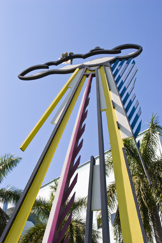 Mermaid adopts the concrete of Art Deco Miami Beach for a surrealist Henry Moore/ Barbara Hepworth-type perforated reclining nude sculpture floating weightlessly on concrete waves leaping from a little pool. Its own light rays oddly hold up the steel bright sun. Materials are transformed by color and pattern in celebration of sea, sand and sun plus a mythical temptress of the deep blue sea shaded by a living palm.
