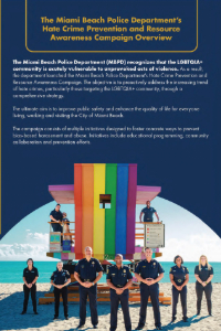 The LGBTQIA+ community is acutely vulnerable to unprovoked acts of violence. As a result, the department launched the Miami Beach Police Department's Hate Crime Prevention and Resource Awareness Campaign. The objective is to proactively address the increasing trend of hate crimes, particularly those targeting the LGBTQIA+ community, through a comprehensive strategy. The ultimate aim is to improve public safety and enhance the quality of life for everyone living, working and visiting the City of Miami Beach.